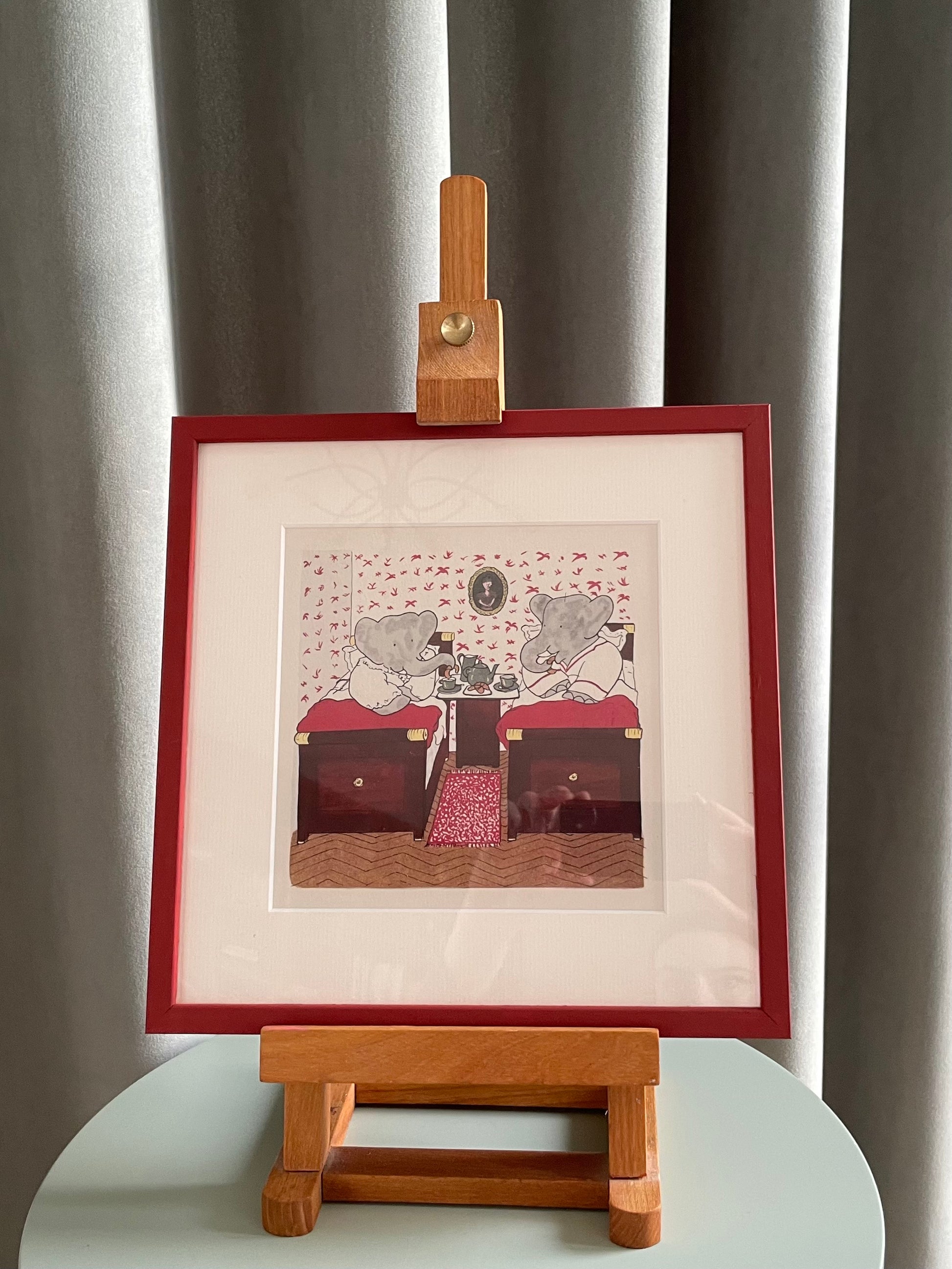 Wouldn't we all love to wake up like this, croissants and maybe a cup of hot chocolate served in bed? This is a re-print of a vintage Babar, Jean de Brünhoff, illustration in a made-to-measure passepartout and frame. We have hand painted the frame in this warm vintage red color. Unique piece.