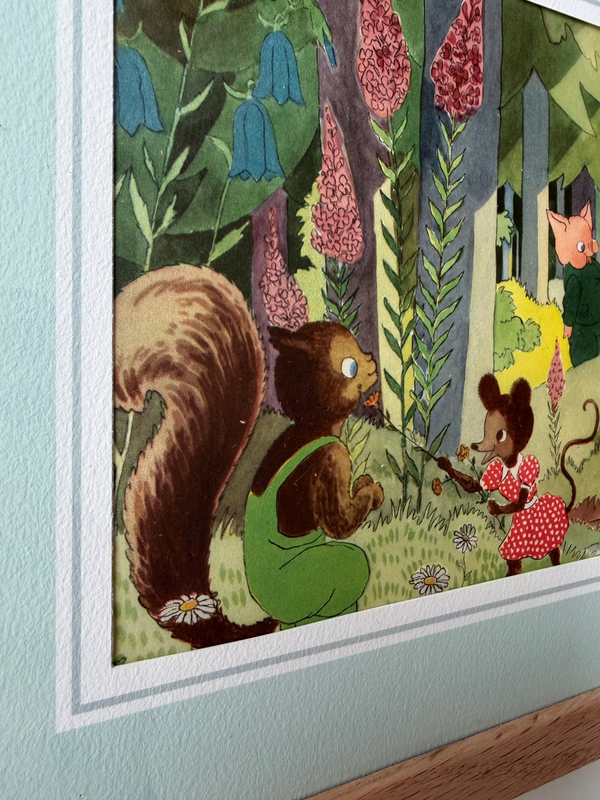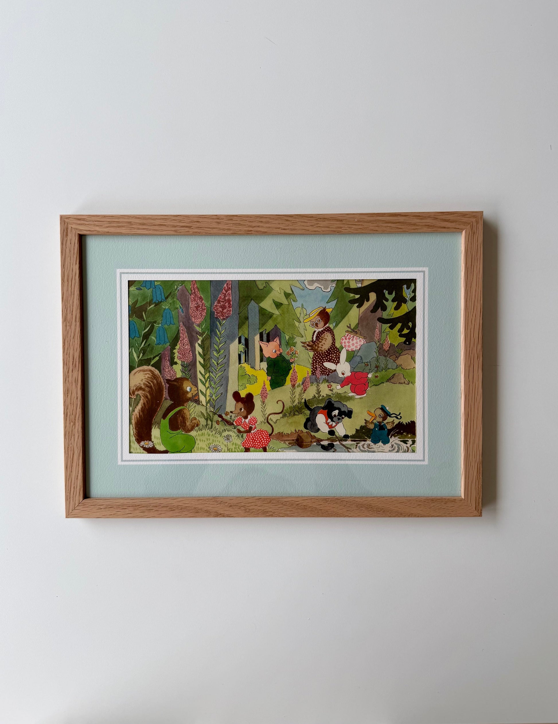 A unique illustration from a danish children's book from 1949. This book cut-out is matched with a simple thin passepartout that highlights the tenderness of the color palette. Oak frame from our Scandinavian manufacturer. Only one available.