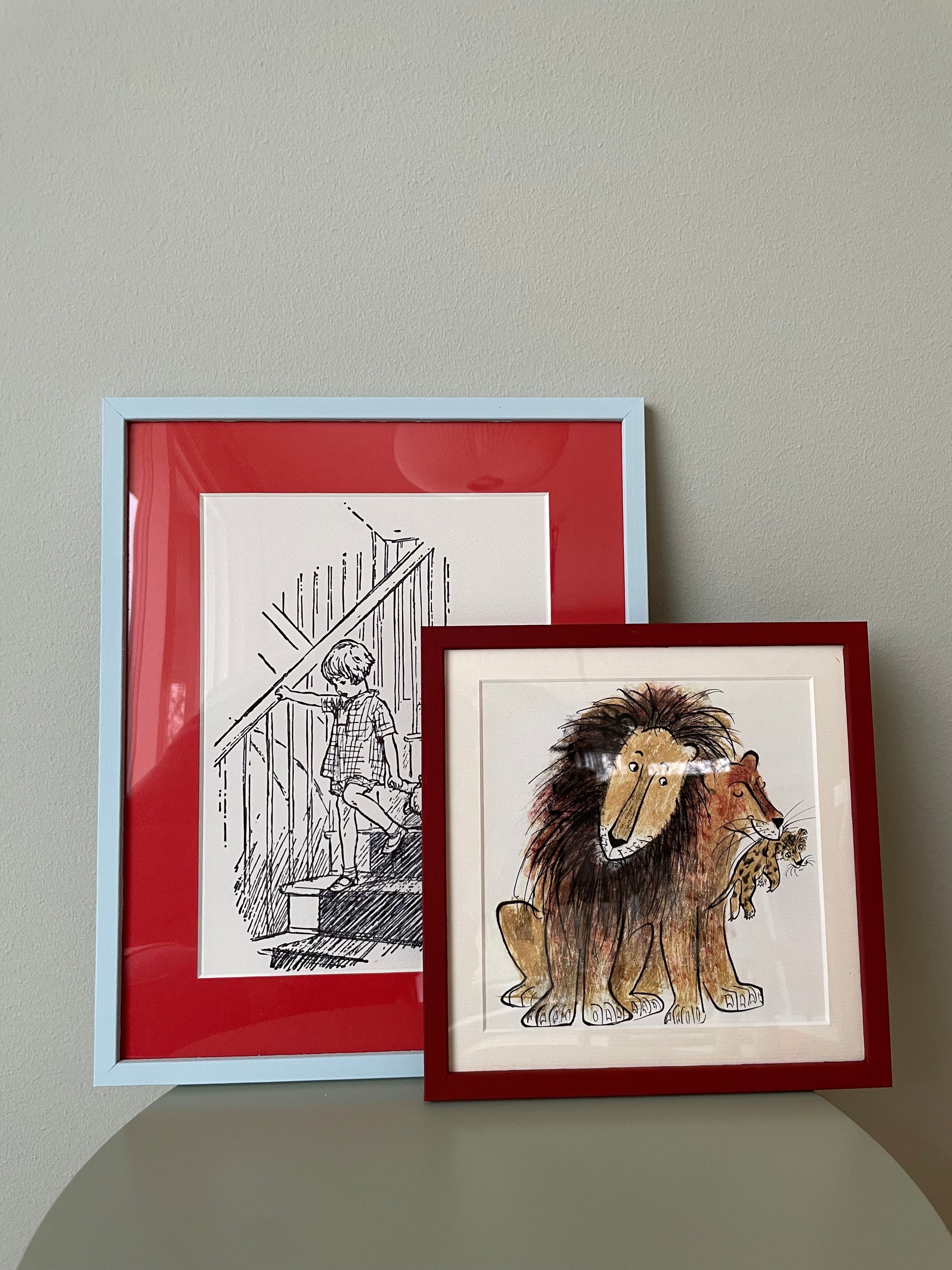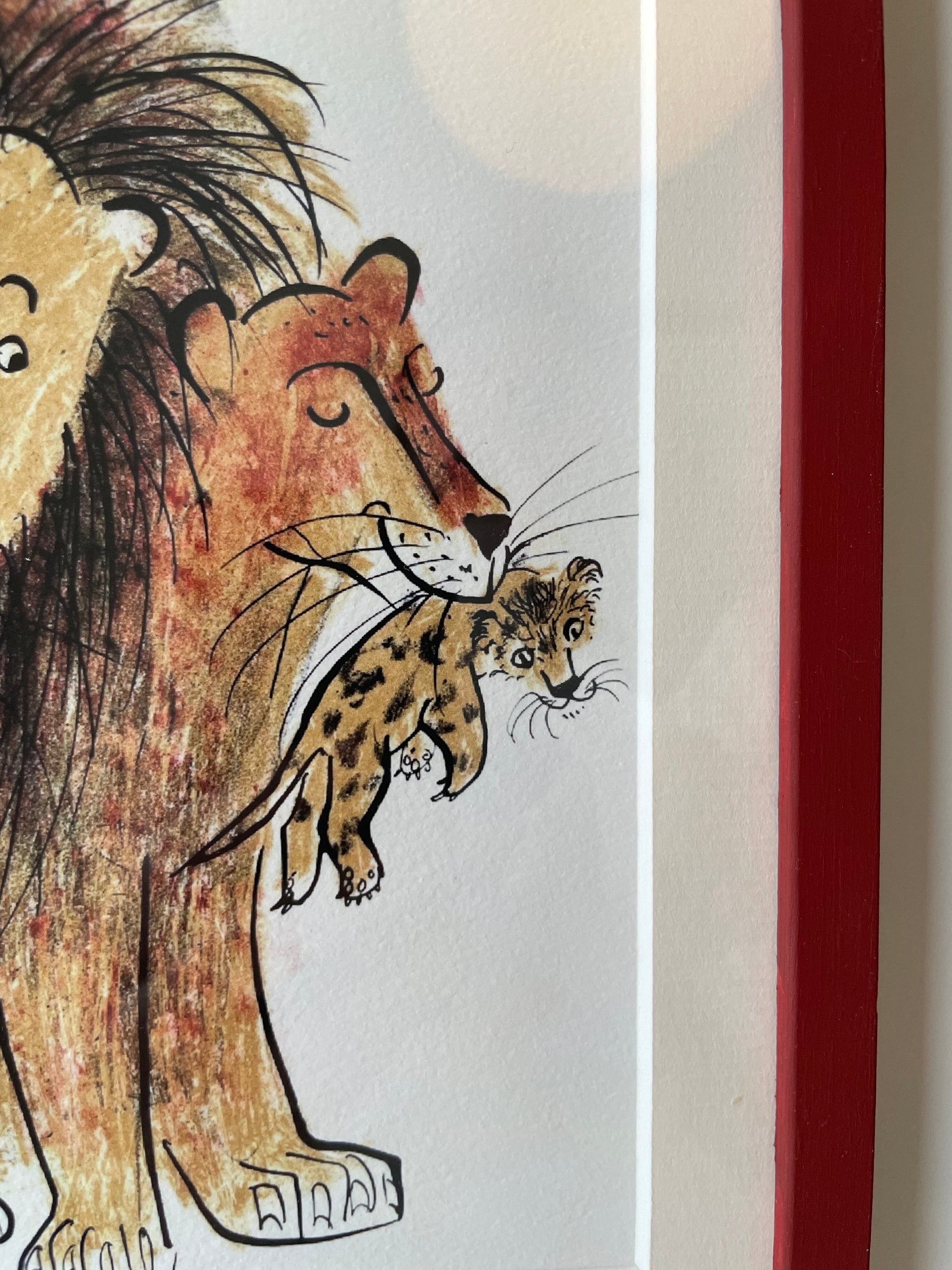 From the classic book The Happy Lion we found this adorable illustration of mom and dad and their little lion cub. Hand painted frame in a vintage red. Frame and passepartout made to measure.