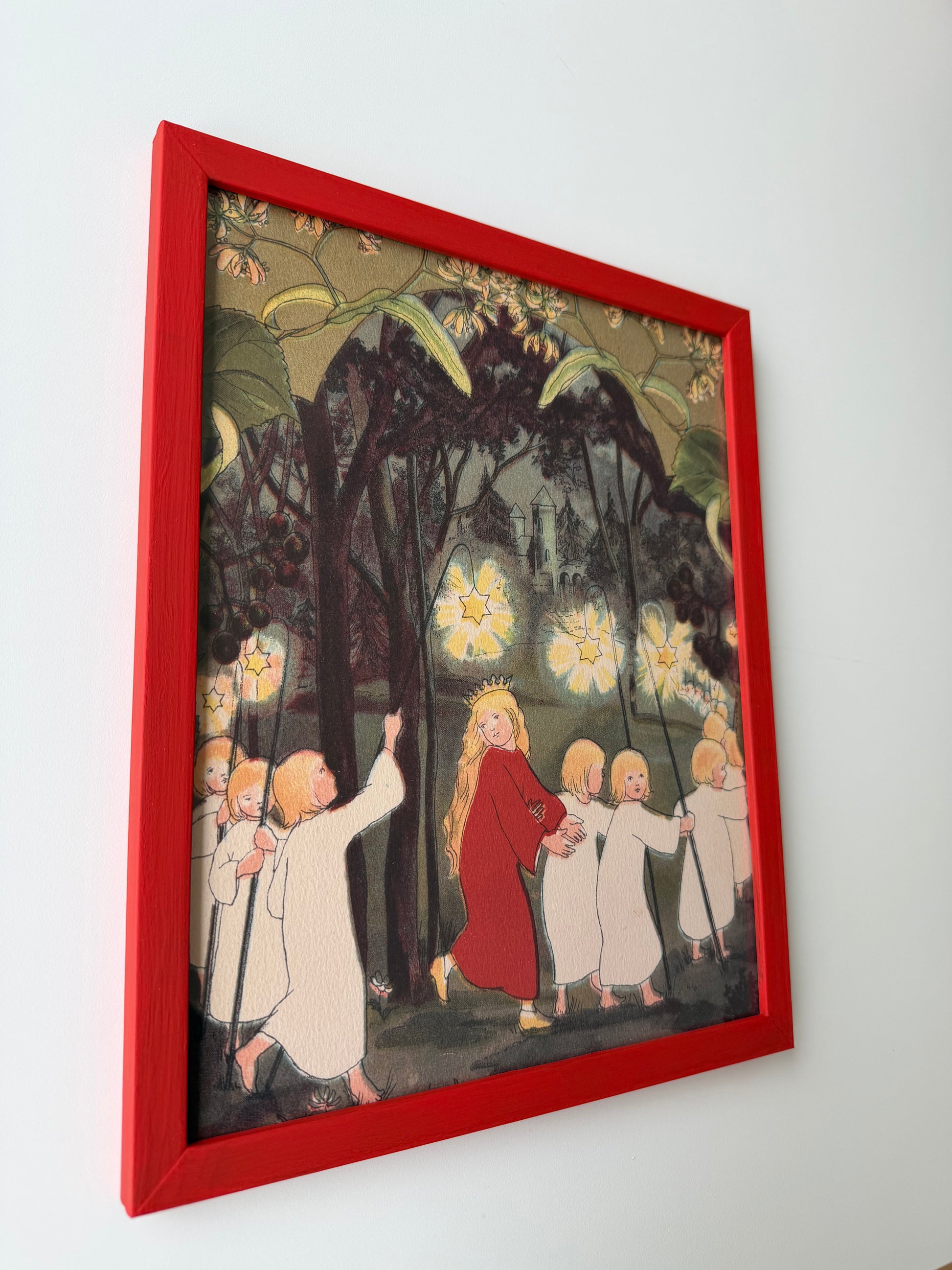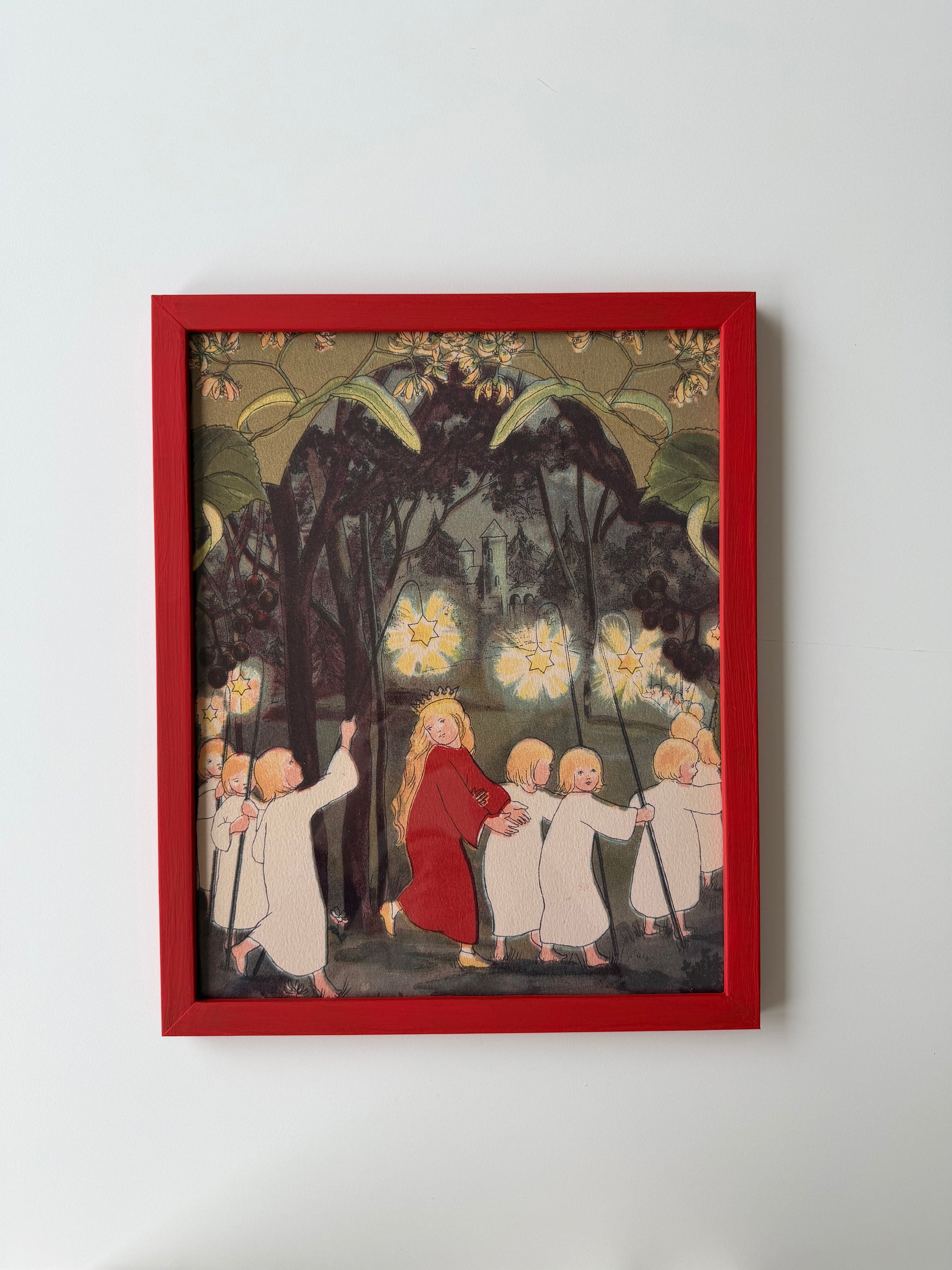 This is a reprint of one of Sibylle Von Olfers enchanted illustrations from the book "The Princess in the Forest" from 1909. It is matched with a hand painted frame in the beautiful royal red color matching her dress. Bringing the magic of a forest at night dimly lit with lanterns right into the rooms of little children. Sigh!