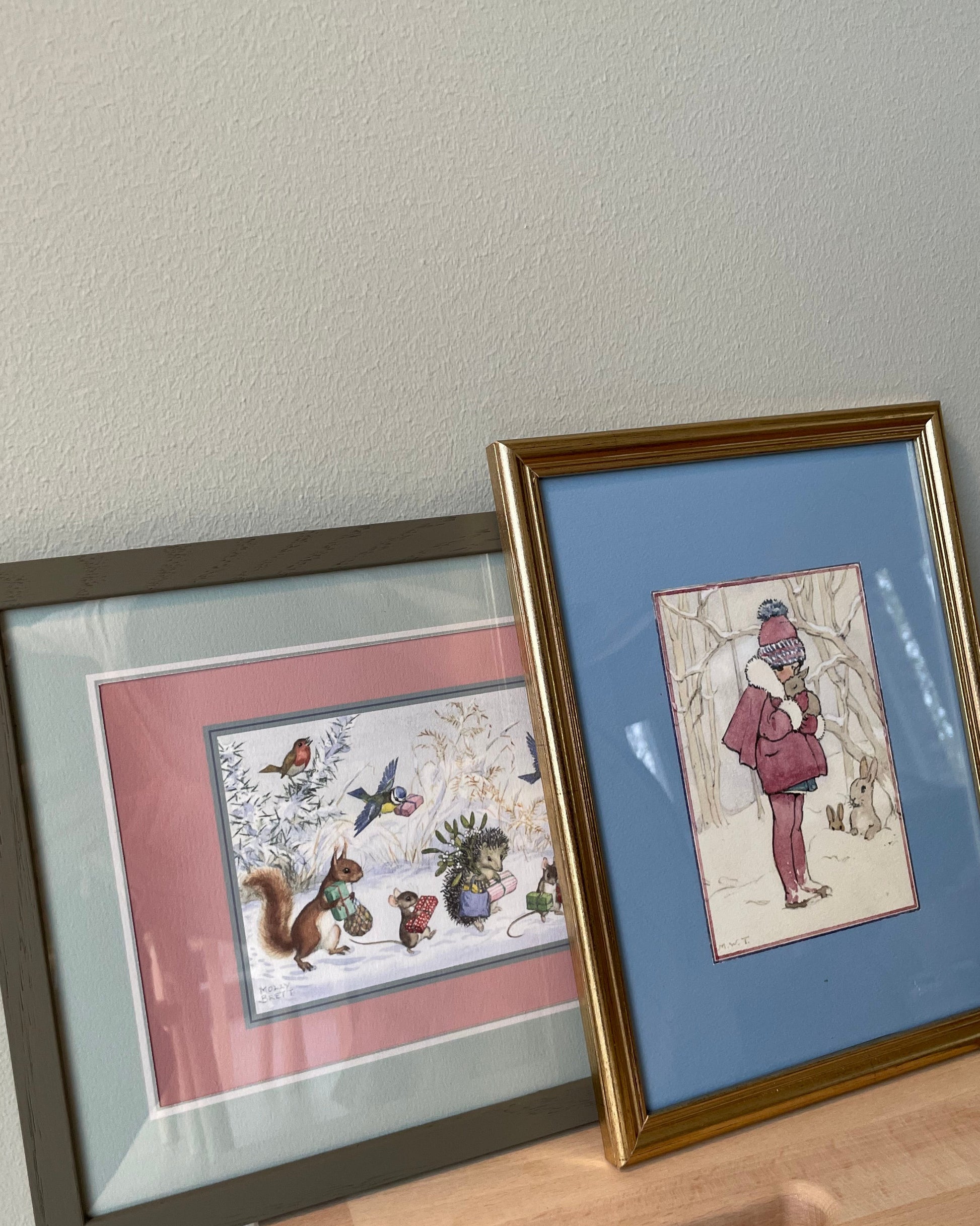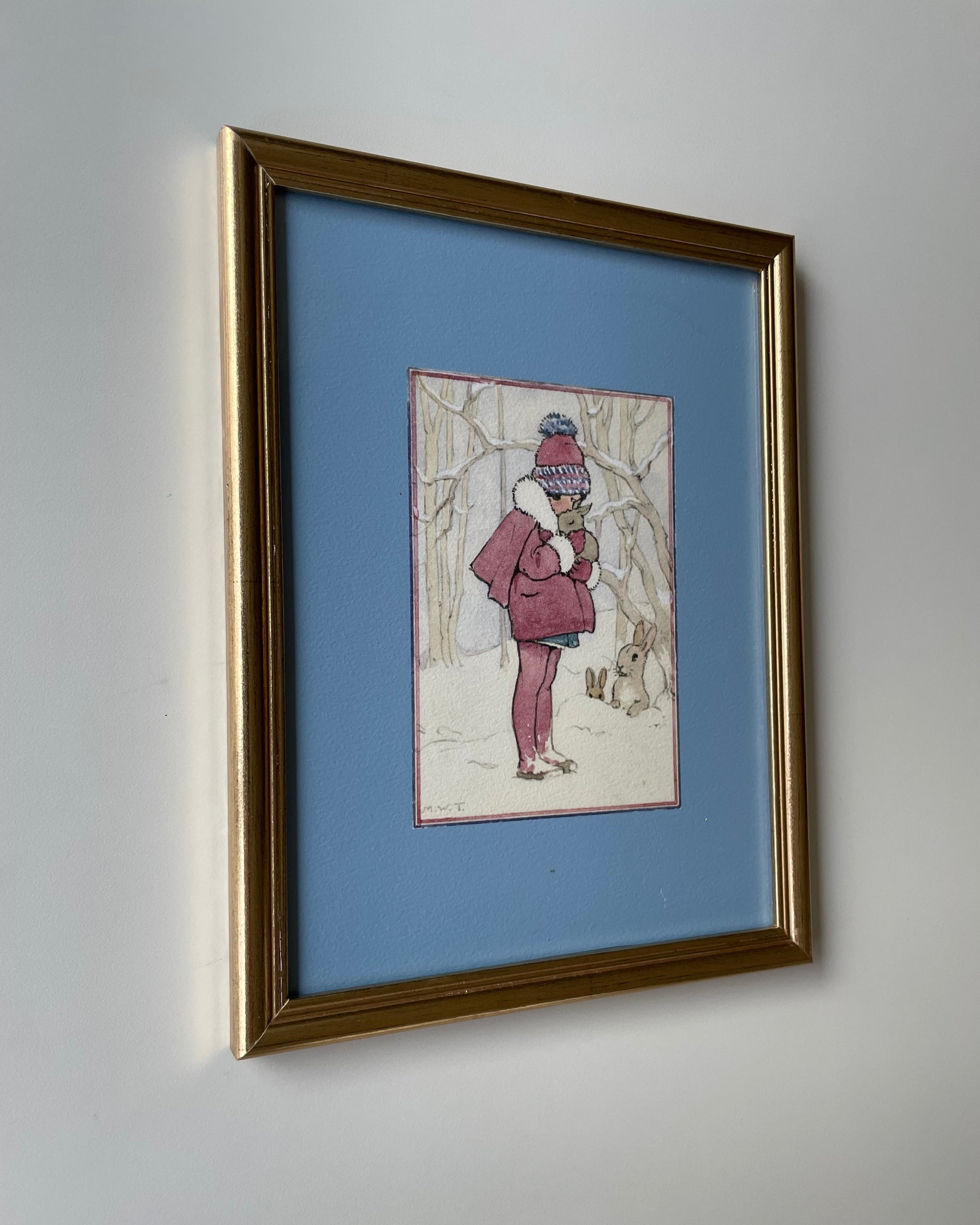 This is a unique vintage print matched with a new vintage style frame. The cutest little thing, and perfect if you seek a little winter wonderland or snowy dreams to enter your little one's imagination.