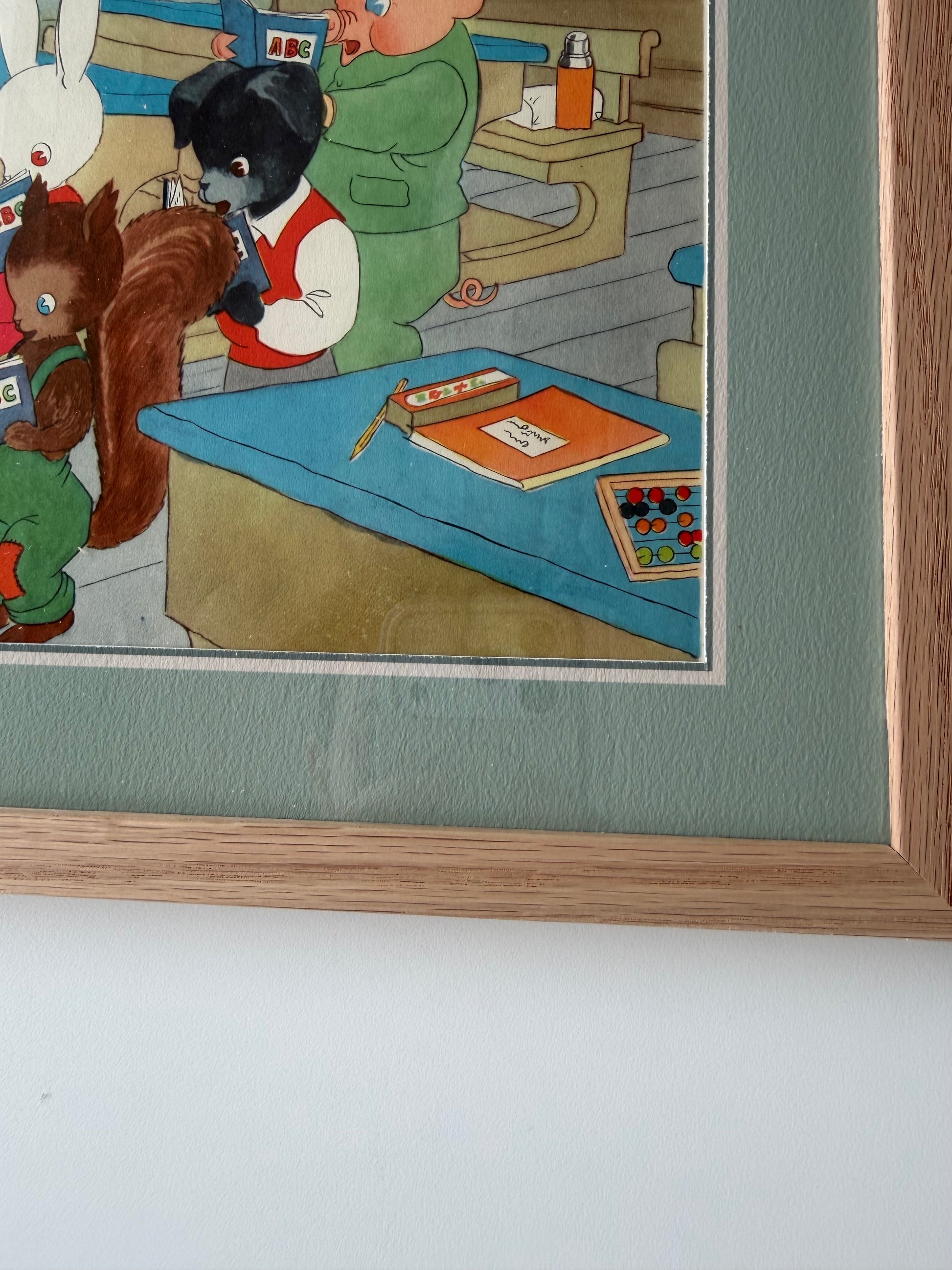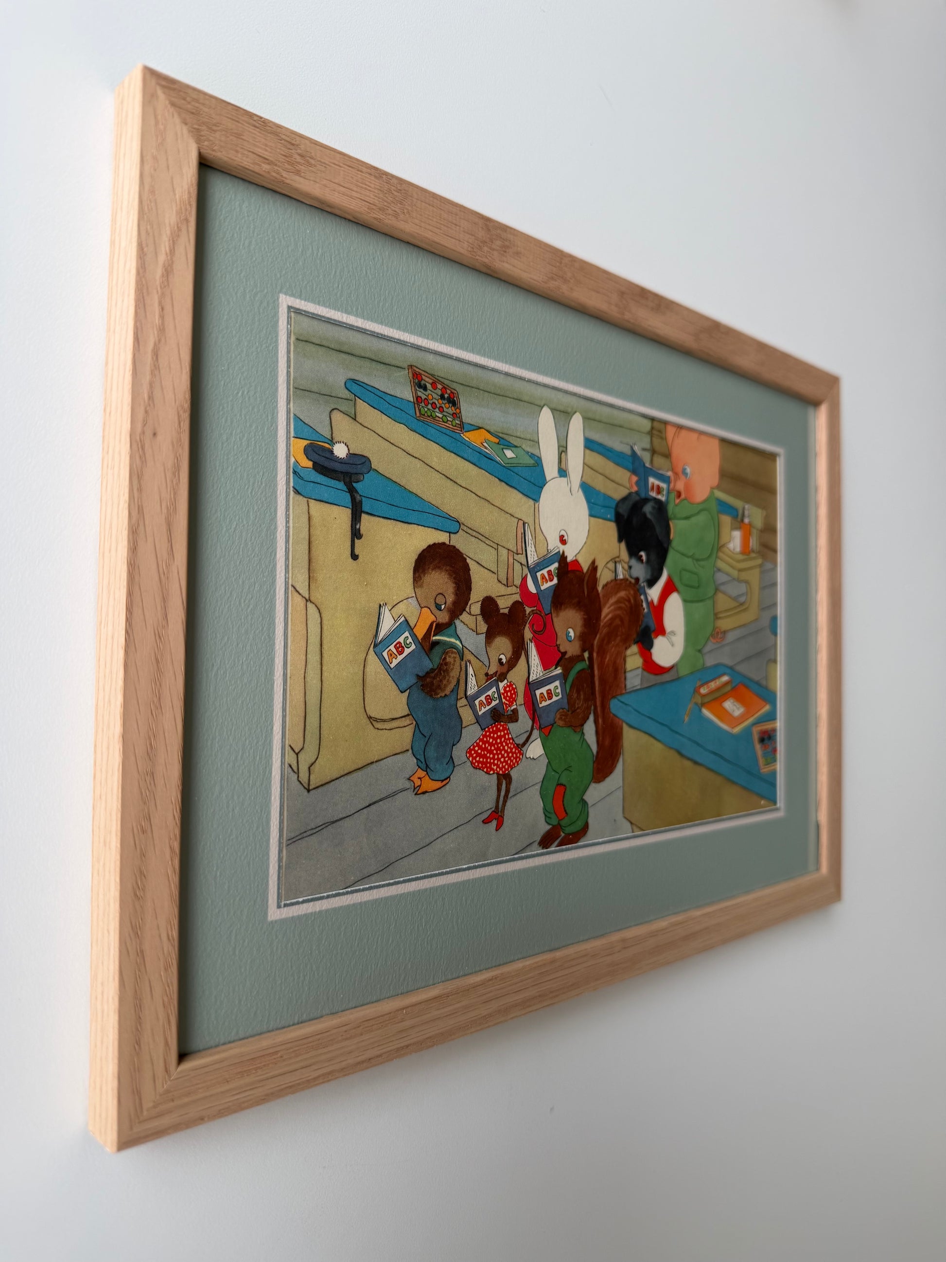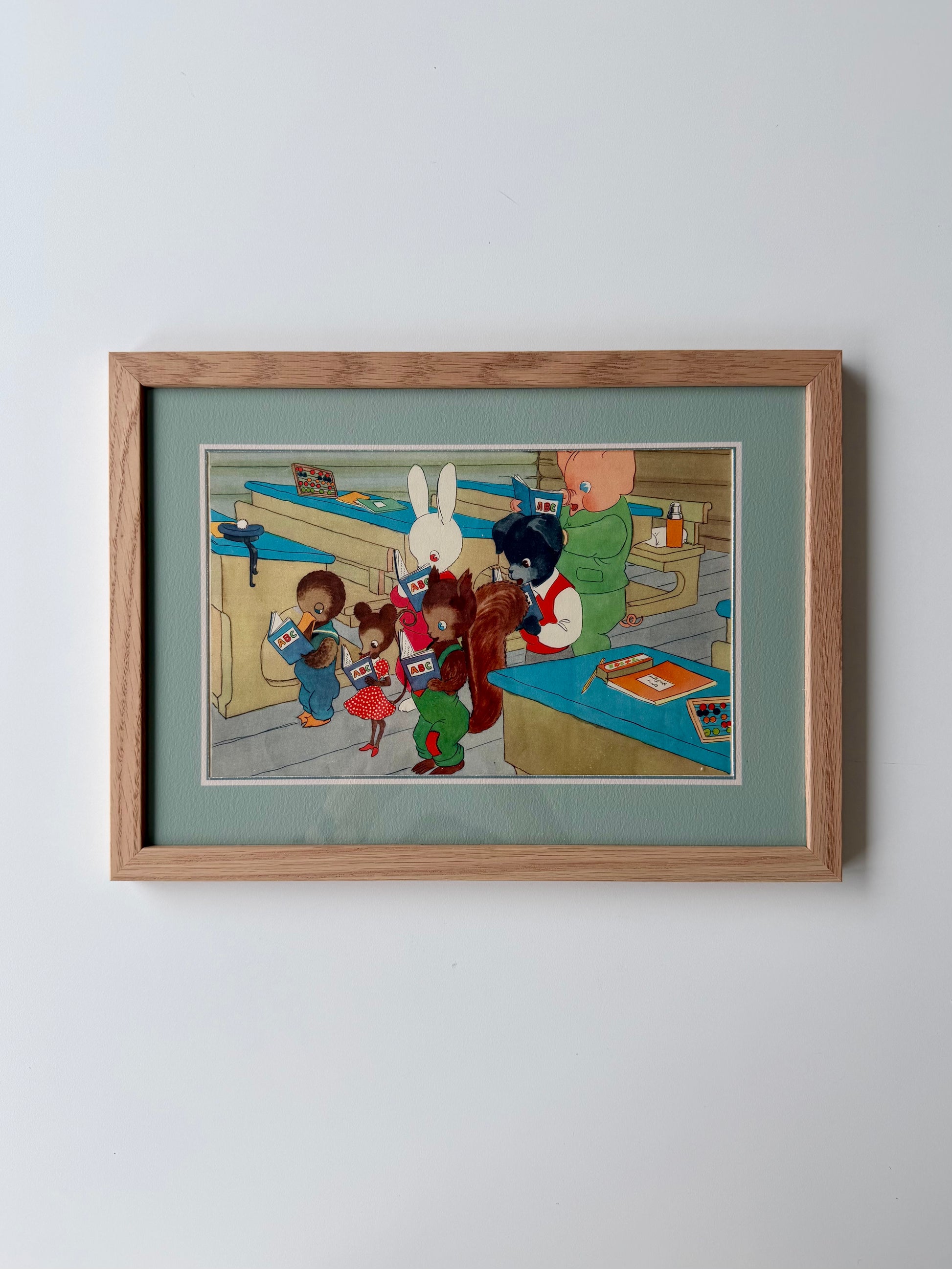A unique illustration from a danish children's book from 1949. This book cut-out is matched with a simple thin passepartout that highlights the tenderness of the color palette. Oak frame from our Scandinavian manufacturer. Only one available.